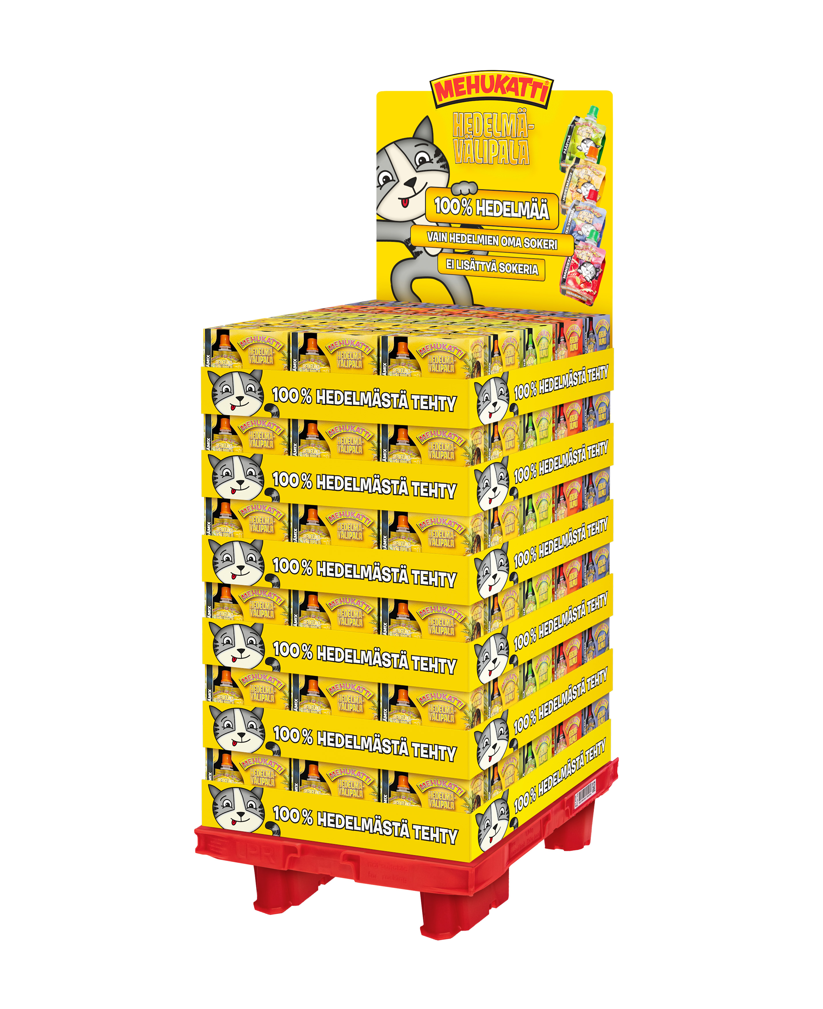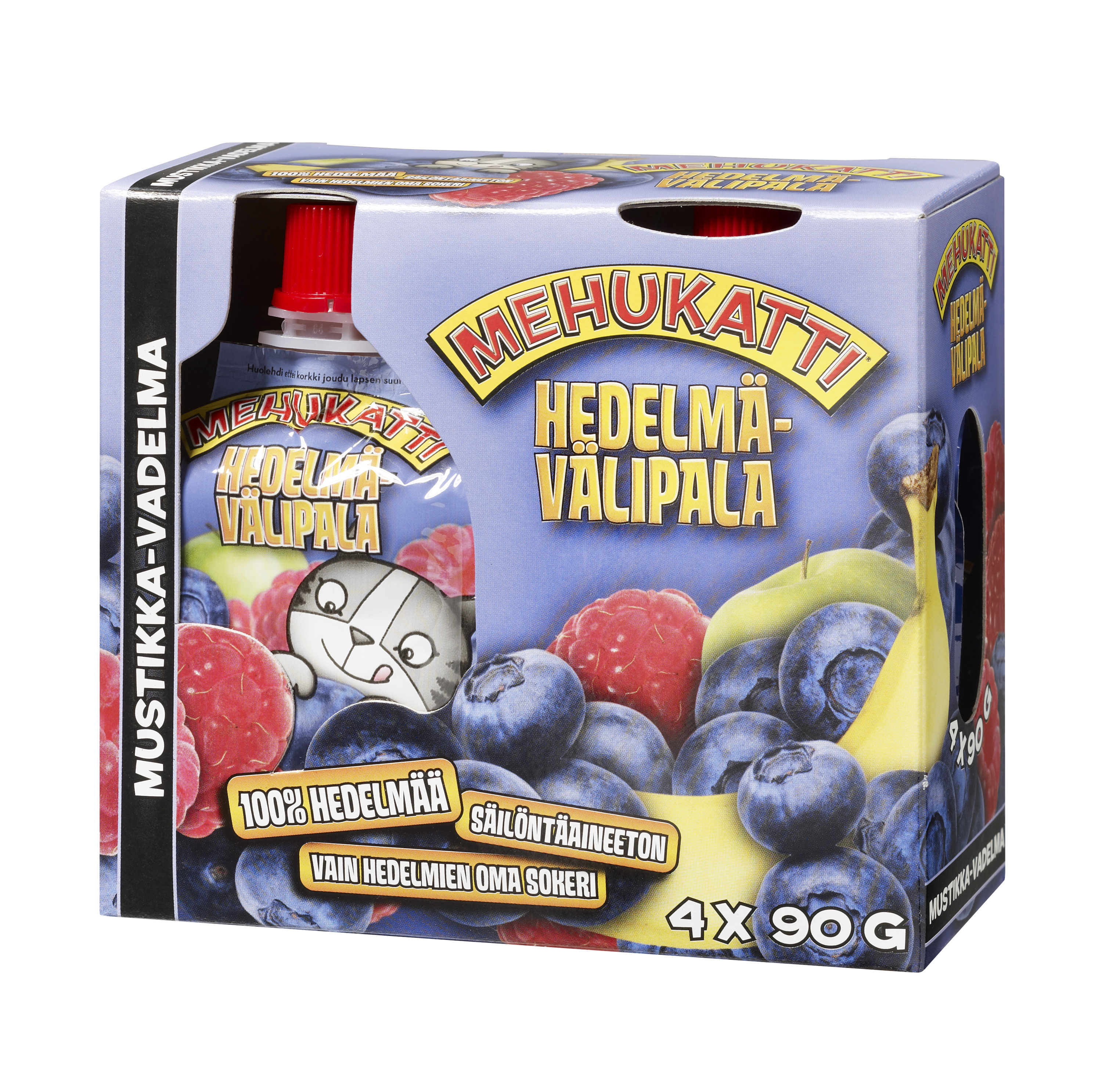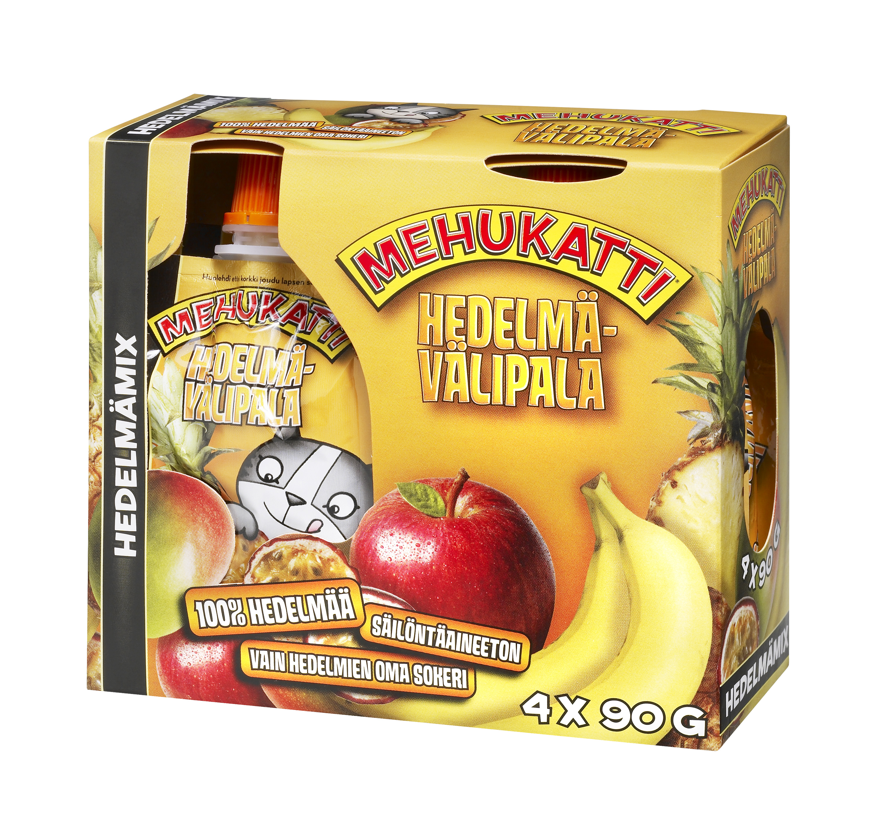Mehukatti välipala neljän maun sekavarttilava. Lavassa on 186 kpl 4x90g välipalapakkauksia: 60x hedelmämix, 42x mansikka, 42x päärynä ja 42x mustikka-vadelma.